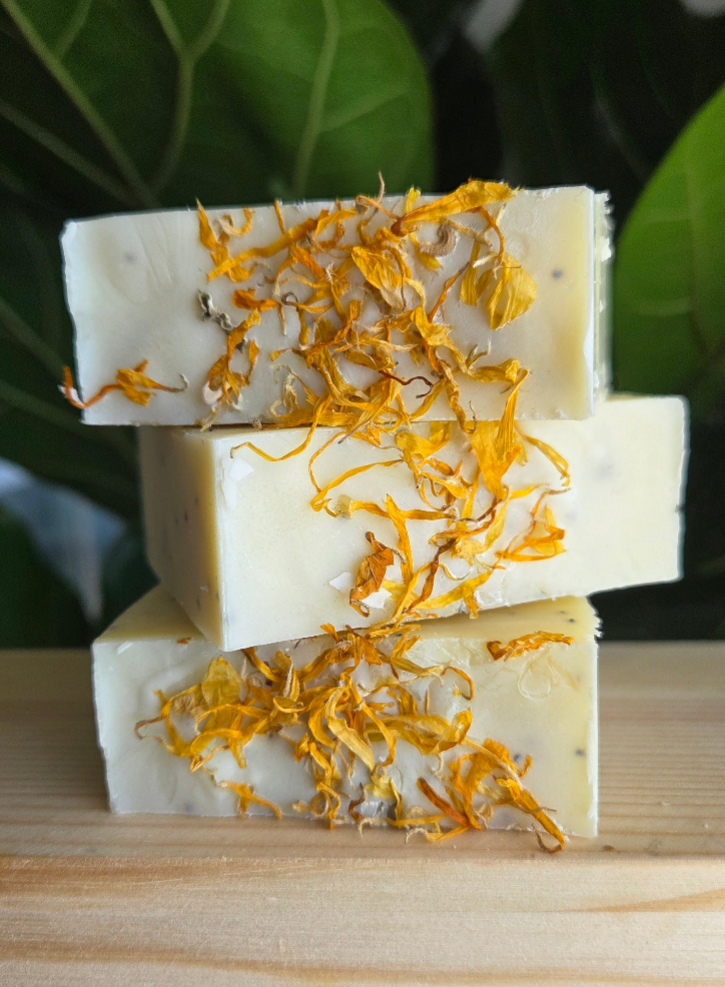 Ingredients: beef tallow, extra virgin olive oil infused with calendula flowers, distilled water, sodium hydroxide (lye), castor oil, tangerine essential oil, Brazilian yellow clay, poppy seeds, dried calendula flowers